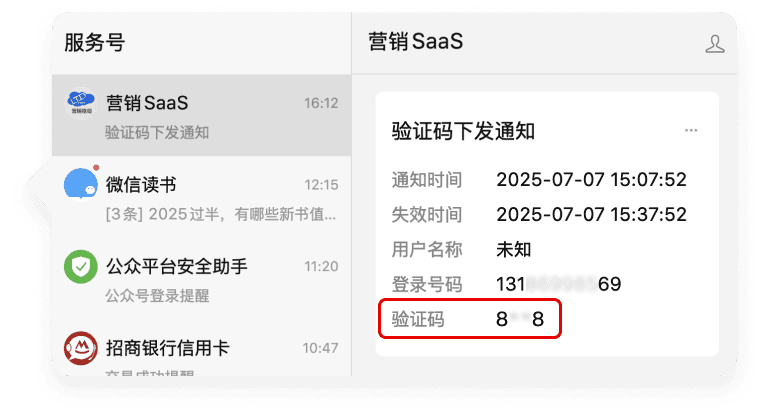 驗證碼將通過“營銷SaaS”公眾號下發(fā)